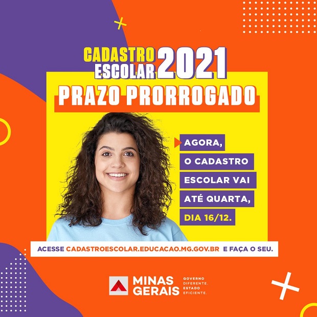 Atenção pais e/ou responsáveis e estudantes maiores de 18 anos. Foi prorrogado, até a próxima quarta-feira (16/12), o prazo para a realização do cadastro escolar para estudar na rede pública de ensino de Minas Gerais em 2021. O período, que terminaria nesta sexta-feira (11/12), foi ampliado para dar mais conforto às famílias, possibilitando mais tempo para a inscrição. Para fazer o cadastro é necessário acessar o Sistema Único de Cadastro e Encaminhamento para Matrícula (SUCEM) no endereço eletrônico cadastroescolar.educacao.mg.gov.br.