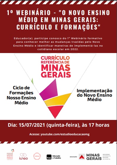 Nesta quinta-feira (15/7), profissionais que atuam no ensino médio em escolas públicas e privadas de Minas Gerais poderão acompanhar o primeiro de uma série de webinários que irão debater o Novo Ensino Médio em Minas Gerais. A live de lançamento do “Ciclo de Formações Nosso Ensino Médio” terá como tema “O Ensino Médio em Minas Gerais: Currículo Referência e Formações”. O evento virtual terá início às 17h e pode ser acompanhado pelo link https://www.youtube.com/watch?v=T50bB1t56-M.