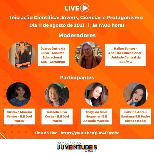 Todos os estudantes da rede estadual de ensino estão convidados a participar da live e conhecer um pouco mais sobre a experiência dos jovens e ações de incentivo à iniciação científica que a SEE/MG vem promovendo, como a seleção de projetos de pesquisa para alunos e professores orientadores da rede pública estadual, que está com inscrições abertas até 23 de agosto.