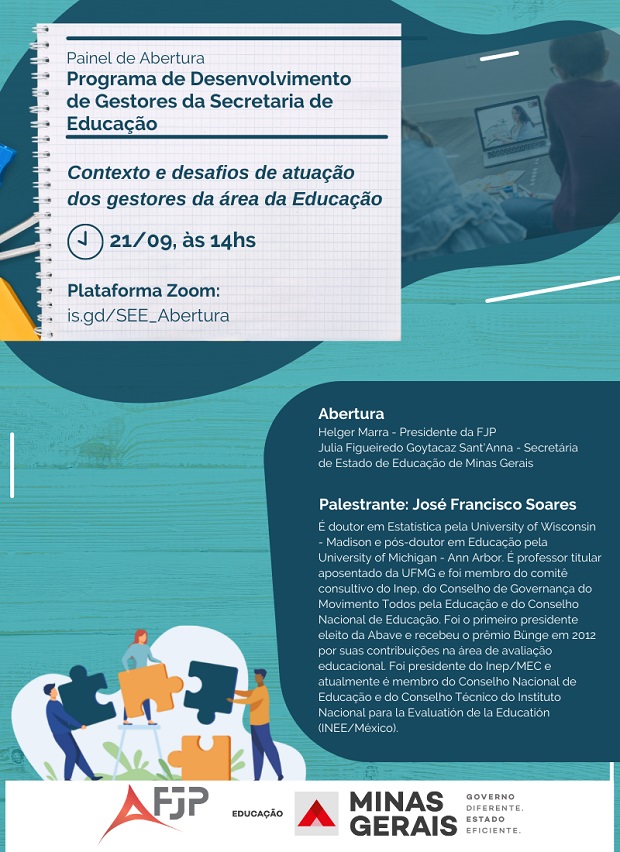 A aula inaugural vai ocorrer nesta terça-feira, 21 de setembro, com a participação da secretária de Estado de Educação de Minas Gerais, Julia Sant’Anna, e do professor emérito da UFMG e ex-presidente do Instituto Nacional de Estudos e Pesquisas Educacionais Anísio Teixeira (Inep), José Francisco Soares.