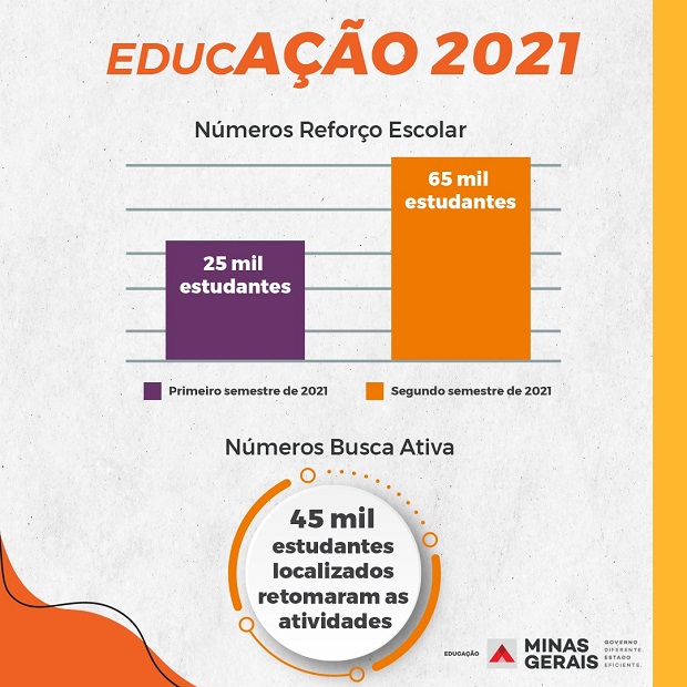 Iniciativas consolidadas na Secretaria de Estado de Educação de Minas Gerais (SEE/MG) tiveram continuidade ao longo de 2021. A Busca Ativa e o programa de Reforço Escolar foram reforçados e se despontaram ainda mais como importantes estratégias para garantir a permanência dos estudantes nas escolas e para a consolidação do aprendizado dos alunos, mesmo diante de todas as dificuldades impostas pela pandemia da Covid-19.