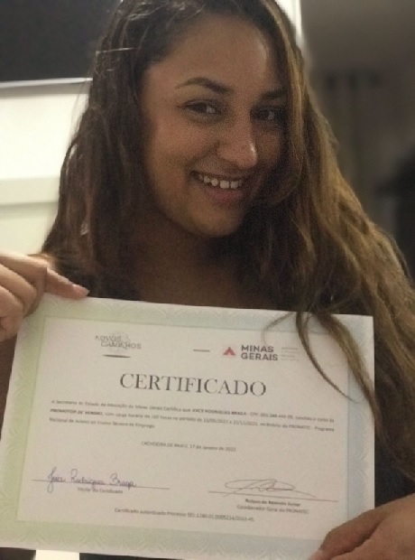 Joice Rodrigues exibindo, com orgulho, o certificado de conclusão do curso de promotor de vendas. Foto: Arquivo Pessoal