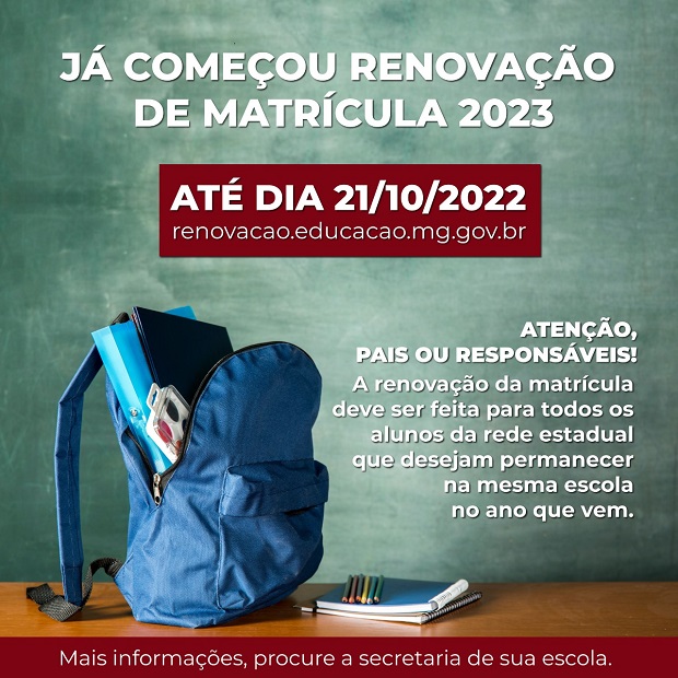 Atenção, estudantes, pais ou responsáveis de alunos na rede estadual de ensino de Minas Gerais! Começa, nesta terça-feira (4/10), o período para renovação de matrícula dos alunos que desejam permanecer na mesma instituição em 2023. O processo deve ser realizado de forma on-line pelos pais, responsáveis ou o estudante maior de 18 anos, pelo site https://renovacao.educacao.mg.gov.br. O direito de permanência na escola, para o ano letivo seguinte, será garantido ao aluno que renovar dentro do prazo, que vai até o dia 21 de outubro.