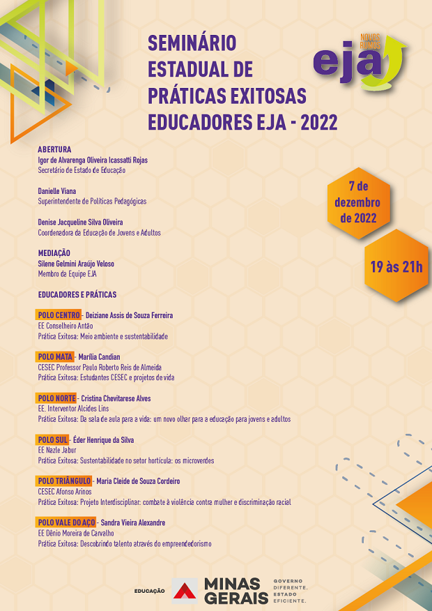 A Secretaria de Estado de Educação de Minas Gerais (SEE/MG), por meio da Coordenação da Educação de Jovens e Adultos, promoverá o “Seminário Estadual de Práticas Exitosas Educadores EJA 2022”. O evento será virtual, na próxima quarta-feira (7/12), das 19h às 21h, e a transmissão será nesta página do Youtube.