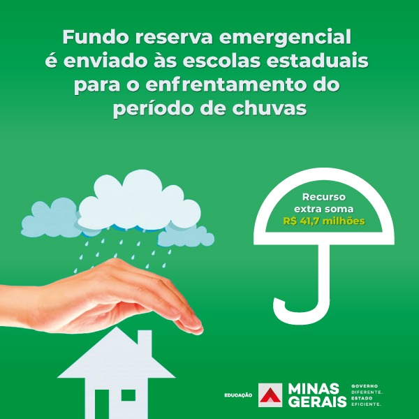 Prevendo possíveis danos causados pela grande quantidade de chuvas neste período do ano, a Secretaria de Estado de Educação de Minas Gerais (SEE/MG) liberou um aditivo no recurso de Manutenção e Custeio Predial a todas as 3.461 unidades escolares da Rede. Este recurso é destinado a pequenos e médios reparos na infraestrutura dos prédios. A verba, já liberada aos gestores, soma R$41,7 milhões. A liberação desse recurso emergencial tem o objetivo de manter as escolas com dinheiro em caixa para eventuais sinistros causados pela chuva deste final de ano.