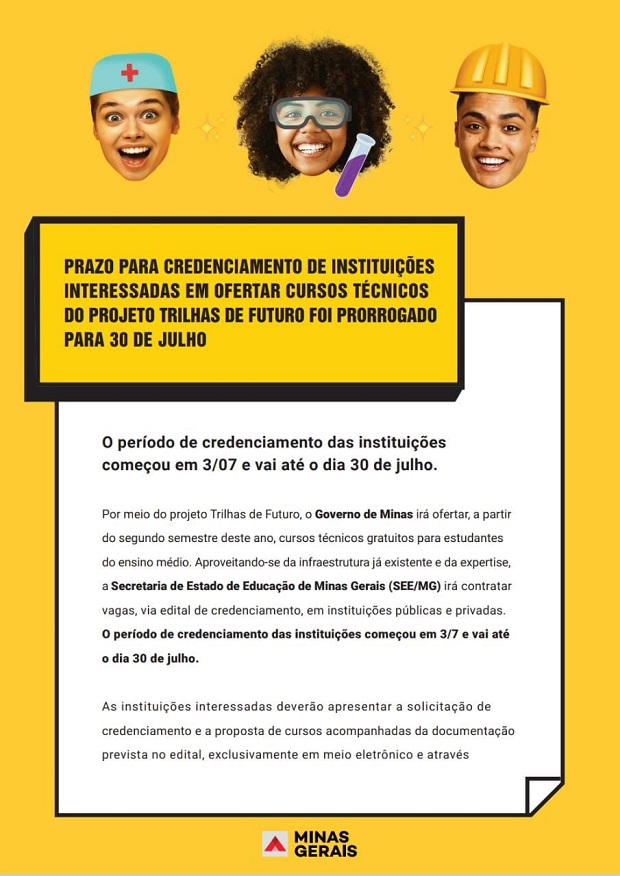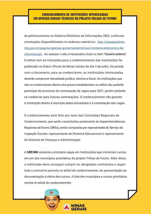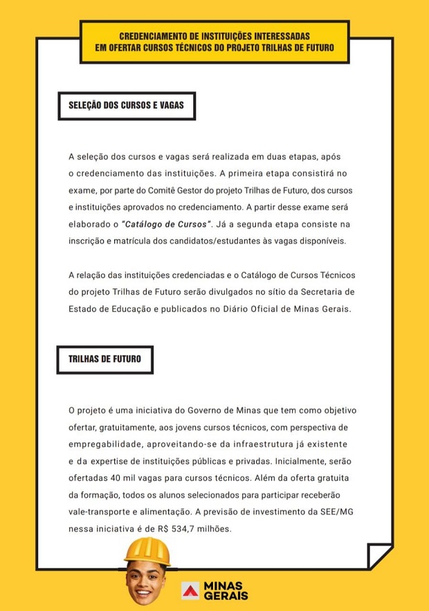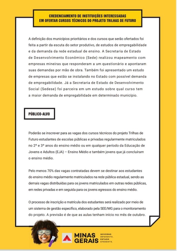 Credenciamento de instituições públicas ou privadas, com ou sem fins lucrativos, que poderão ofertar formação profissional e técnica de nível médio, quando o Projeto Trilhas de Futuro estiver em execução, conforme especificações, exigências e quantidades estabelecidas neste Edital e seus anexos.