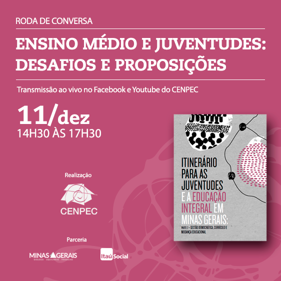 O Centro de Estudos e Pesquisas em Educação, Cultura e Ação Comunitária (CENPEC), em parceria com a Secretaria de Estado de Educação de Minas Gerais (SEE), promove hoje (11/12) uma roda de conversa para o lançamento da publicação “Itinerário para as juventudes e a educação integral em Minas Gerais – Parte 2: Gestão democrática, currículo e mudança educacional”. O evento, que acontece em São Paulo, será transmitido ao vivo, pelo Facebook da organização, de 14h as 17h30.