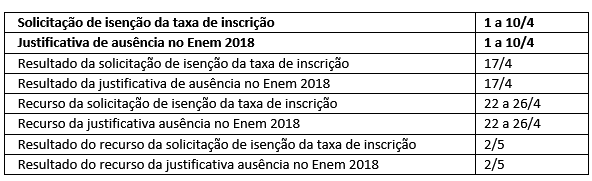 O Inep divulgará o resultado das solicitações de isenção no dia 17 de abril. É responsabilidade do participante acompanhar a situação do pedido no Sistema Enem. Se a solicitação de isenção for negada, o participante pode recorrer da decisão entre os dias 22 e 26 de abril. Se a solicitação de isenção da taxa for aceita, não significa que o participante está inscrito. Todos os interessados em fazer o Enem, isentos ou pagantes, precisam fazer a inscrição, entre 6 e 17 de maio.