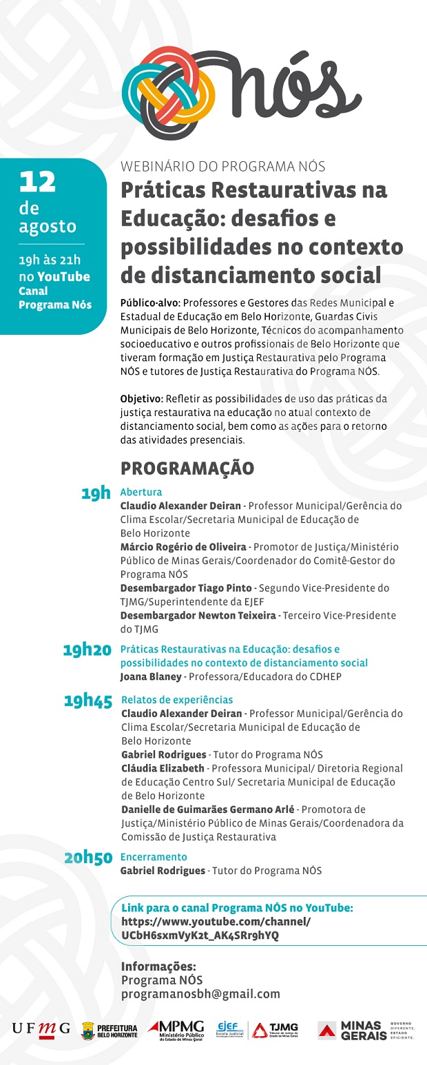 No próximo dia 12 de agosto o Programa Nós (Núcleos para Orientação e Solução de conflitos escolares) vai realizar o webinário “Práticas Restaurativas na Educação: Desafios e Possibilidades no Contexto de Social”. A iniciativa é Voltada a professores e gestores escolares, além de guardas municipais da capital, técnicos do acompanhamento socioeducativo e outros profissionais. O encontro será on-line, das 19h às 21h, com transmissão pelo canal Programa Nós, no Youtube.
