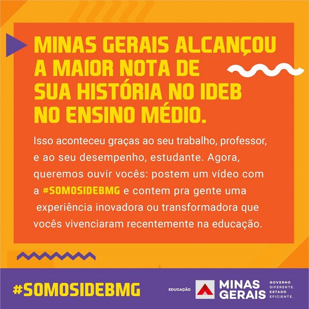 Nessa terça-feira (15/9), os números do Índice de Desenvolvimento da Educação Básica (Ideb), divulgados pelo Ministério da Educação, apontaram que, depois de um apagão na educação, Minas retomou o crescimento e está de volta no caminho certo. Os dados alcançados na rede pública estadual de ensino foram expressivos e comemorar esses números é muito importante. Por isso, te convidados a compartilhar deste momento, que é conquista de todos, usando #SomosIdebMG.