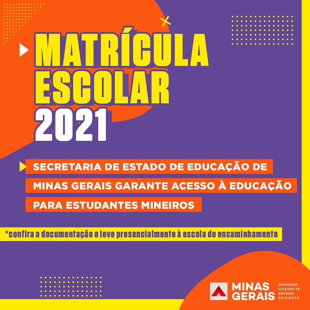 A matrícula na rede pública estadual de ensino de Minas Gerais começou na última segunda-feira (01/02) em todos os municípios do estado. Para garantir a vaga, os pais/responsáveis do aluno ou o aluno maior de 18 anos devem levar toda documentação presencialmente na escola de encaminhamento. Contudo, por causa da pandemia da Covid-19, alguns municípios mineiros ainda não concluíram o ano letivo de 2020. Assim, diante do contexto de excepcionalidade e para garantir os direitos dos estudantes em anos de terminalidade (5º e 9º) , a Secretaria de Estado de Educação de Minas Gerais (SEE/MG) irá efetivar a matrícula no ano escolar de 2021, dos estudantes de outras redes de ensino antes do término do ano letivo de 2020, mesmo sem a integralização da carga horária letiva na escola de origem.