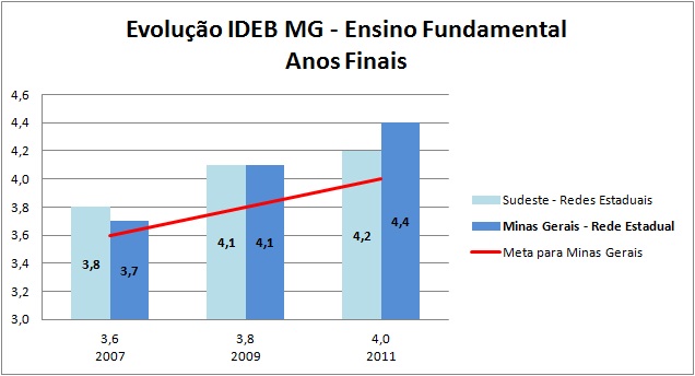 Com Ideb de 4,4, a rede estadual mineira alcançou antecipadamente a meta estipulada para 2013, que é justamente de 4,4. Em relação ao último índice apurado, em 2009, a rede estadual apresentou evolução, passando de 4,1 para 4,4.