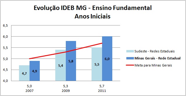 Considerando o Ideb de todas as redes — estadual, municipais e privadas — Minas Gerais também conseguiu destaque. O índice alcançado foi de 5,9 e também ultrapassa antecipadamente a meta estipulada para 2013, que é de 5,7.
