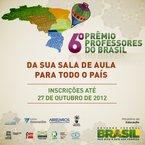 Os professores das escolas públicas que tiverem experiências pedagógicas bem sucedidas no enfrentamento de situações-problemas podem se inscrever no Prêmio Professores do Brasil do Ministério da Educação (MEC), que está em sua sexta edição. As inscrições para “Professores do Brasil” vão até o dia 27 de outubro, e a premiação inclui importâncias em dinheiro no valor de R$ 7 mil, além da entrega de troféus, placas comemorativas e certificados expedidos pelas instituições promotoras do prêmio.