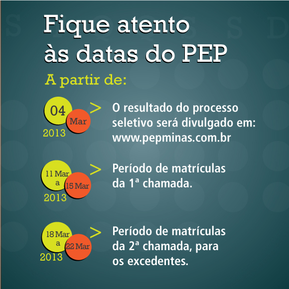 PEP Os candidatos que concorrem às vagas nos cursos técnicos do Programa de Educação Profissional (PEP) devem ficar atentos ao calendário do processo seletivo, que a partir do dia 04 de março, divulgará os resultados no site do Programa.