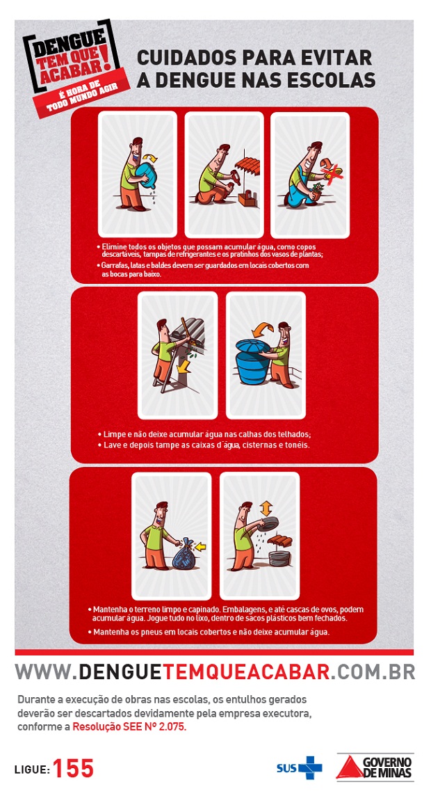 Para auxiliar a sociedade a desenvolver ações com foco na prevenção e combate a doença, o Governo de Minas criou a campanha “Dengue tem que acabar! É hora de todo mundo agir”. A iniciativa, que é coordenada pela Secretaria de Estado de Saúde, tem entre seus objetivos fortalecer a mobilização contra a dengue no Estado.
