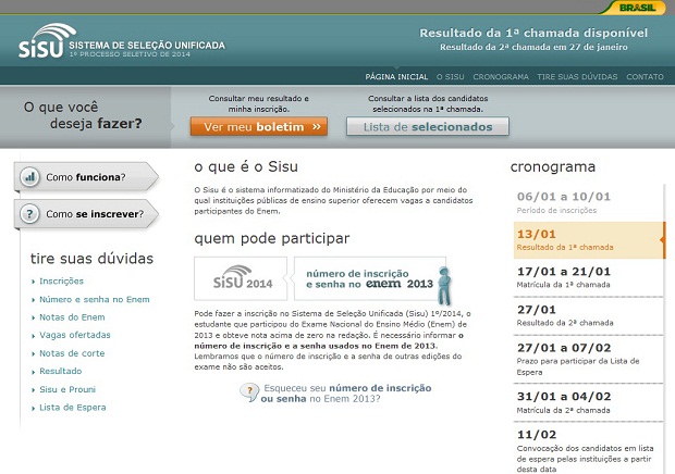 O Ministério da Educação (MEC) divulgou na manhã desta segunda-feira (13-01) a lista de chamada dos aprovados na primeira edição de 2014 do Sistema de Seleção Unificada (Sisu). O resultado pode ser consultado pelo site http://sisu.mec.gov.br, nas instituições participantes e na Central de Atendimento do MEC pelo telefone 0800-616161.