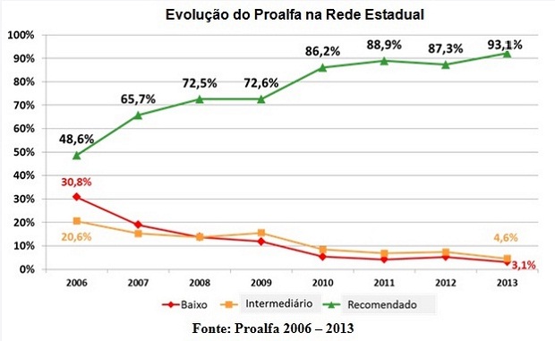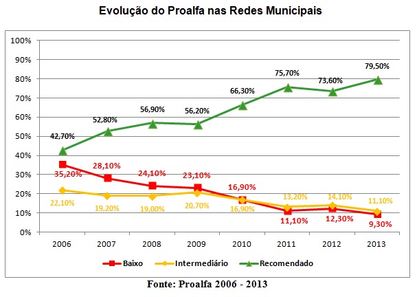 Além do expressivo aumento no percentual de alunos no nível recomendável, os dados do Proalfa registraram diminuição do percentual de alunos no chamado nível baixo. Nesse nível, o estudante fica abaixo do esperado tanto no que diz respeito à compreensão do que é abordado, quanto na execução de tarefas e avaliações.