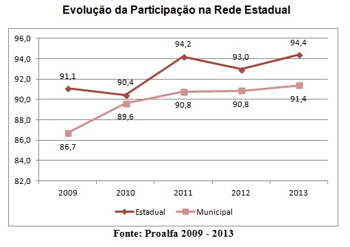 Outro aspecto positivo apontado pelo exame foi a elevação no índice de participação. Em 2013, 94,4% dos estudantes do 3º ano do ensino fundamental na rede estadual fizeram as provas. Isso significa que dos 80.432 que deveriam fazer as provas, quase 76 mil participaram. Esse também é um percentual nunca antes atingido na história do Proalfa em Minas Gerais.