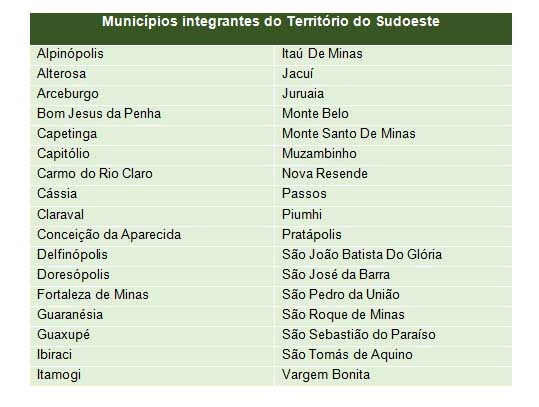 O Fórum Regional de Governo – Território Sudoeste, abrange 34 municípios distribuídos em três microterritórios (Passos, Guaxupé e São Sebastião do Paraíso). Esses grupos de trabalho têm por objetivo incluir a participação popular na elaboração, execução, monitoramento e avaliação de políticas públicas regionalizadas.