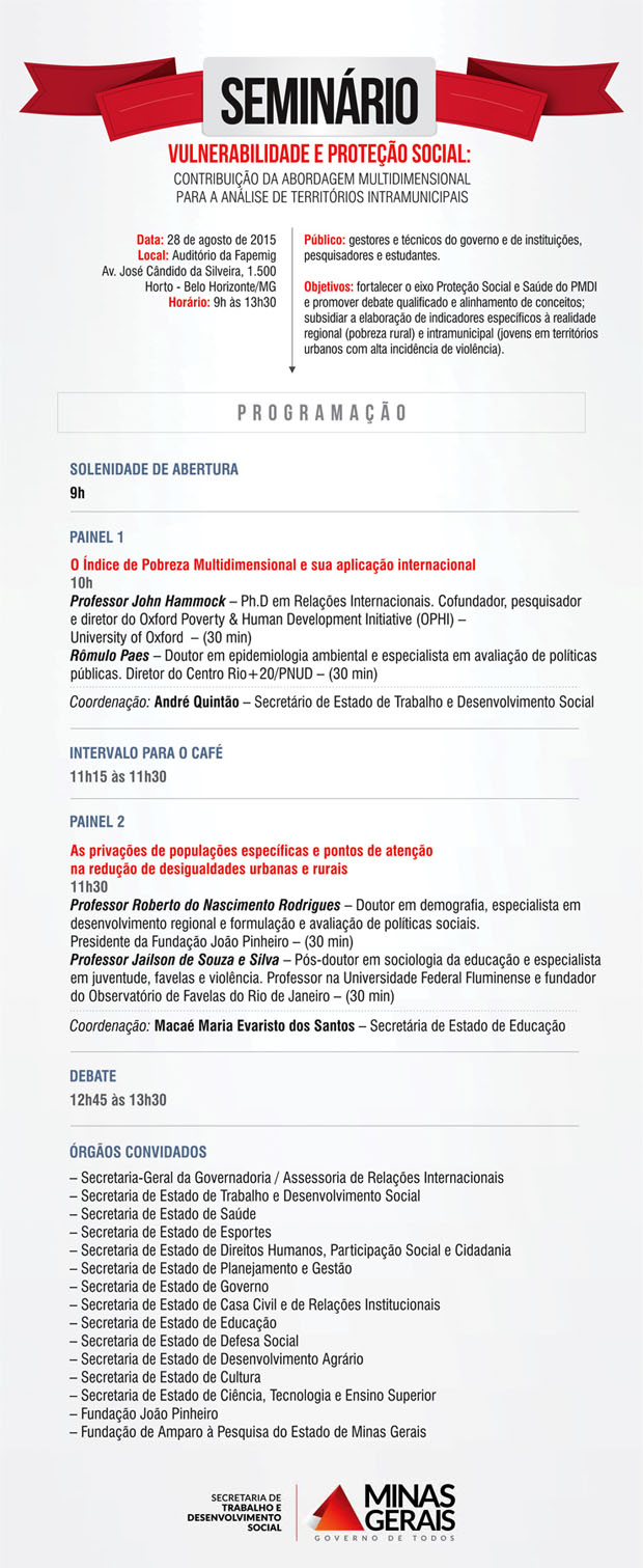Para subsidiar o Governo do Estado na construção de indicadores específicos para combater a desigualdade social, em especial a pobreza rural e a pobreza de jovens em territórios urbanos de vulnerabilidade social, a Sedese, em parceria com a Secretaria da Casa Civil, promove nesta sexta-feira (28) o seminário “Vulnerabilidade e Proteção Social: Contribuição da Abordagem Multidimensional para Análise de Territórios Intramunicipais”. O seminário é importante contribuição para o fortalecimento do Eixo Saúde e Proteção Social do Governo de Minas Gerais.
