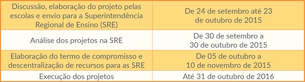 Cada escola poderá apresentar uma proposta, sendo que os recursos disponibilizados variam segundo o número de estudantes de cada uma delas. As propostas devem ser encaminhadas para as respectivas Superintendências Regionais de Ensino (SRE) até o dia 23 de outubro. A execução do projeto deverá ocorrer até 31 de outubro do ano que vem (confira o cronograma abaixo).