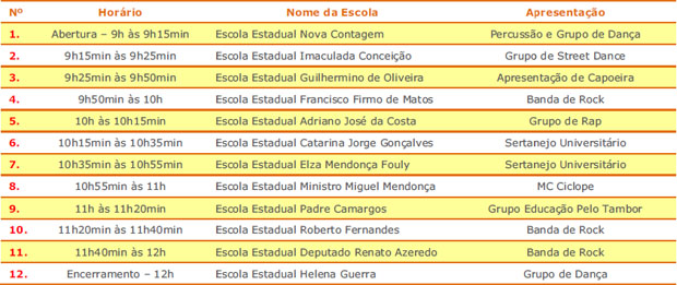 Durante as apresentações, o público vai conhecer um pouco mais sobre a campanha que está em andamento, promovida pela Secretaria de Estado de Educação (SEE), para chamamento dos jovens que deixaram as salas de aula, e que termina no próximo dia 30 de novembro. Iniciada em outubro, esta campanha disponibiliza um formulário online para os adolescentes que querem retomar os estudos. O jovem pode indicar até três escolas onde gostaria de estudar no ano que vem. A Superintendência Regional de Ensino Metropolitana B vai montar um espaço no local para receber as inscrições dos interessados. A Secretaria Municipal de Educação de Contagem também participa da iniciativa.