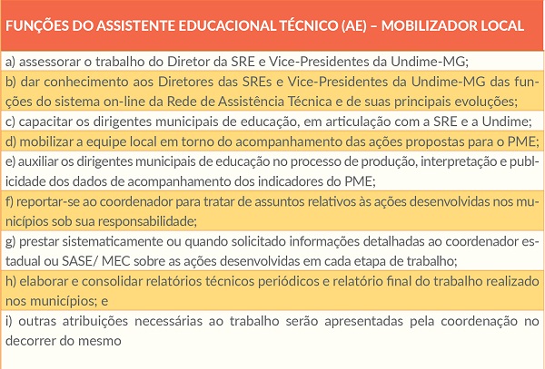 Os Mobilizadores Locais estarão orientando as equipes técnicas dos municípios, para que os PMEs estejam em consonância com a política nacional elaborada pela Secretaria de Articulação com os Sistemas de Ensino do Ministério de Educação (Sase/MEC).