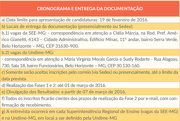 O Ministério da Educação (MEC), com a colaboração da Secretaria de Estado da Educação – SEE-MG, vai apoiar os municípios mineiros durante a fase de execução do Plano Municipal de Educação (PME). Em parceria com a União Nacional de Dirigentes Municipais de Educação (Undime), essa rede de assistência técnica vai ser estruturada de forma regionalizada para dar suporte a cada uma das cidades do estado. Para tanto, foi lançado em 29 de janeiro, o Edital 01/2016.