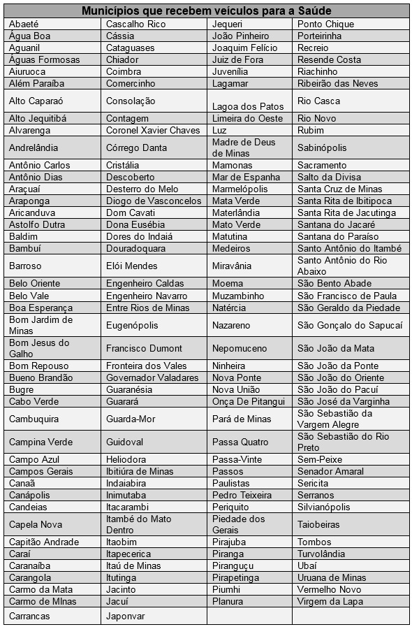 Com investimento de R$ 7,47 milhões, foram entregues para 170 municípios mineiros 181 veículos destinados à assistência à saúde. A entrega faz parte do Programa de Doação de Veículos para Atenção à Saúde dos Municípios do Estado de Minas Gerais, lançado no ano passado, que contempla prefeituras e entidades filantrópicas credenciadas como prestadores de serviço ao Sistema Único de Saúde (SUS). Até o momento foram disponibilizados 1.157 veículos para todas as regiões do Estado.