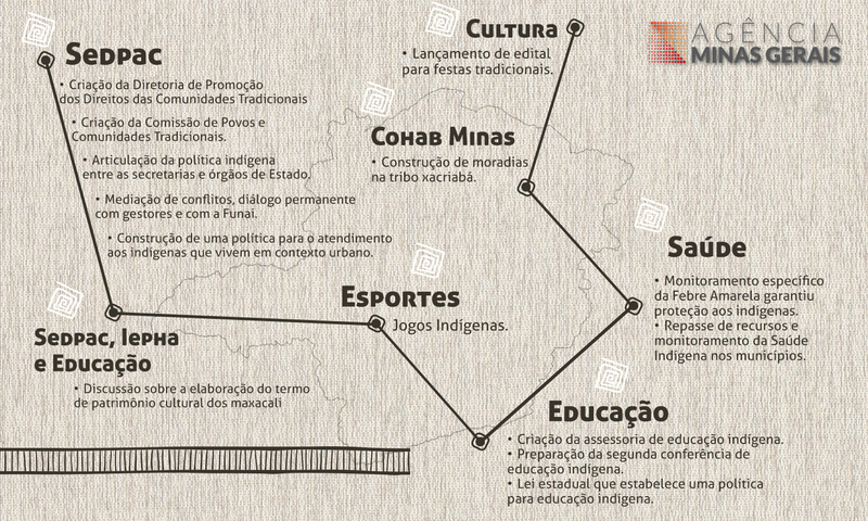 Além disso, a Sedpac também coordena um grupo de trabalho que elaborou esse plano de políticas públicas alinhavado pelas secretarias e órgãos. Todo trabalho de articulação para aldeados e não aldeados é feito por meio da Diretoria das Comunidades e Povos Tradicionais, criada nesta gestão, para atendimento às necessidades específicas dessas populações. Veja o esquema que consolida as principais ações do Governo de Minas Gerais para os indígenas: