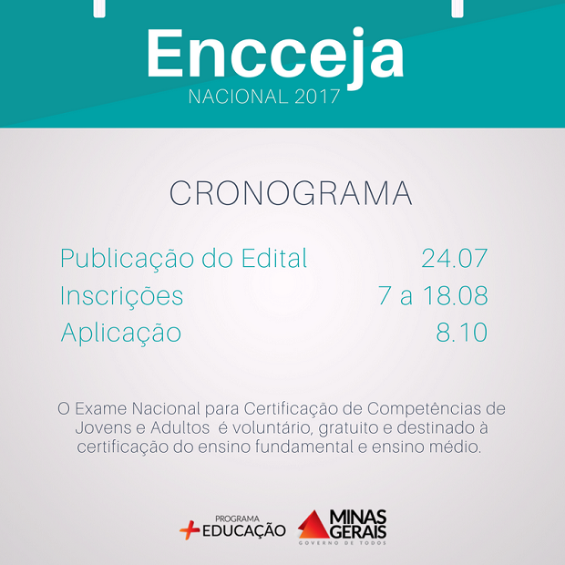 As provas regulares do Exame Nacional para Certificação de Competências de Jovens e Adultos (Encceja), que voltará a oferecer certificação dos ensinos fundamental e médio, serão aplicadas no dia 8 de outubro e as inscrições devem ser feitas de 7 a 18 de agosto. O cronograma foi divulgado ontem (26/06), pelo Ministério da Educação (MEC) e a publicação do edital está prevista para o dia 24 de julho. Com as mudanças anunciadas no Exame Nacional do Ensino Médio (Enem) deste ano, a função de certificação do ensino médio voltou para o Encceja, como ocorria até 2009. O Encceja é voluntário e gratuito.