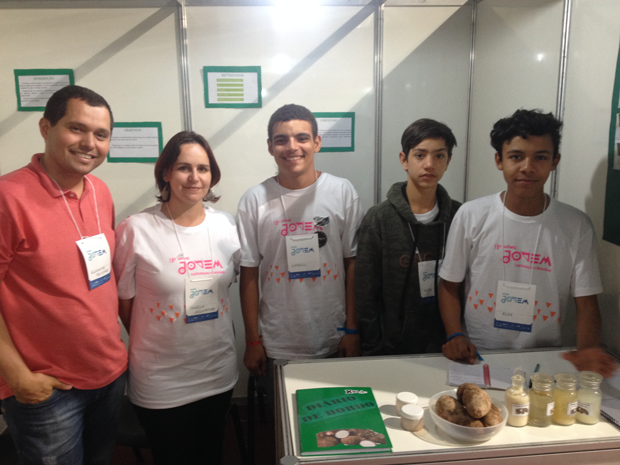 Ao lado dos amigos Bernardo Medeiros e Luís Gustavo da Cruz, e da diretora, Maria Suverlei Santos, Cleidson apresenta o trabalho “Farinha nutricional inovadora”. “Pesquisamos o valor nutricional do jatobá, do amaranto e do baru, típicos da nossa região, para produzirmos uma farinha rica nutricionalmente e que não alterasse o gosto dos alimentos”, conta o estudante.