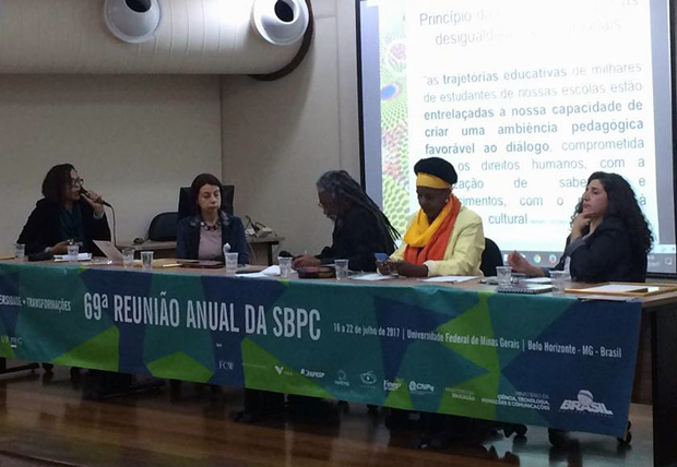 Foi realizada nesta quarta-feira (19/07) a reunião Afroconsciência, dentro da programação da SBPC Afro e Indígena, na 69ª Reunião Anual da Sociedade Brasileira para o Progresso da Ciência (SBPC). O encontro teve como objetivo promover a reflexão e o debate sobre as interfaces da diversidade étnico-racial entre o Ensino Superior e a Educação Básica. O evento, realizado pela Secretaria de Estado de Educação em parceria com o Centro Pedagógico da EBAP/UFMG e a Faculdade de Educação da UFMG, integra as ações da Campanha Afroconsciência, desenvolvida pelo Governo de Minas Gerais, dentro da perspectiva de sensibilização e formação Docente.