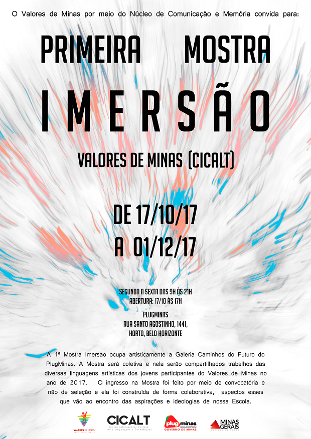 Será inaugurada nesta terça-feira (17/10), às 17 horas, a 1ª Mostra Imersão, com trabalhos de alunos e professores do núcleo Valores de Minas, no Plug Minas, na rua Santo Agostinho, 1.441, bairro Horto. A visitação é aberta ao público, de segunda a sexta feira, de 9 às 21 horas e ocupará o espaço Galeria Caminhos de Minas e todo o entorno do Plug Minas.