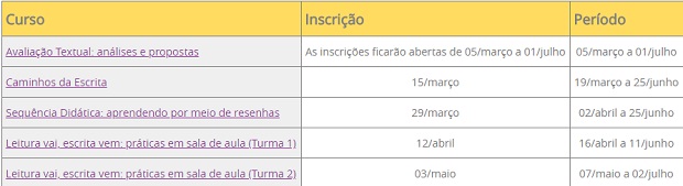 O Programa Escrevendo o Futuro, responsável pela realização da Olimpíada de Língua Portuguesa, retomou as ações de formação a distância e divulgou o cronograma das novas turmas dos cursos on-line: Caminhos da Escrita; Sequência Didática: aprendendo por meio de resenhas; Leitura vai, escrita vem: práticas em sala de aula; e Avaliação textual: propostas e análises.