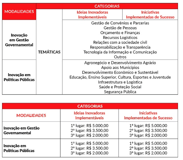 Cada uma das categorias é subdividida em duas modalidades: “Inovação em Políticas Públicas” e “Inovação em Gestão Governamental”. Assim, as ideias e iniciativas inscritas na modalidade “Inovação em Políticas Públicas” deverão apresentar novas formas de atuação do poder público no atendimento de demandas a partir da mobilização de diferentes recursos (humanos, materiais, administrativos e financeiros) e de diferentes atores, públicos, privados ou cidadãos.