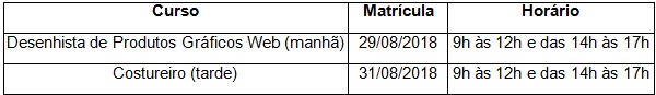 Estão disponíveis para consulta as listas dos aprovados para os cursos de Desenhista de Produtos Gráficos Web e Costureiro do Núcleo de Criação e Design. As matrículas serão realizadas de acordo com a data e horário estabelecidos na tabela abaixo.