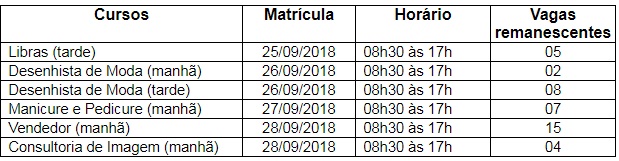 Estão disponíveis para consulta as listas dos aprovados para os cursos de Língua Brasileira de Sinais (Libras), Desenhista de Moda (tarde), Desenhista de Moda (manhã), Manicure e Pedicure, Vendedor e Consultoria de Imagem do Núcleo de Criação e Design. As matrículas serão realizadas de acordo com a data e horário estabelecidos na tabela abaixo.