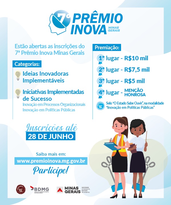 Já estão abertas as inscrições para a 7ª edição do Prêmio Inova Minas Gerais. Servidores, estagiários, bolsistas e empregados públicos do Poder Executivo Estadual podem participar inscrevendo projetos nas categorias “Iniciativas Implementadas de Sucesso”, dividida nas modalidades “Inovação em Processos Organizacionais” e “Inovação em Políticas Públicas”, e “Ideias Inovadoras Implementáveis”. Clique aqui para realizar sua inscrição.
